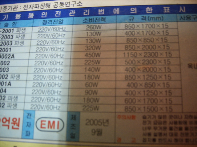 소비전력이 260와트 이고 규격이 850x1700x15인 전기 판넬 입니다. 싱글침대 사이즈 정도 됩니다.